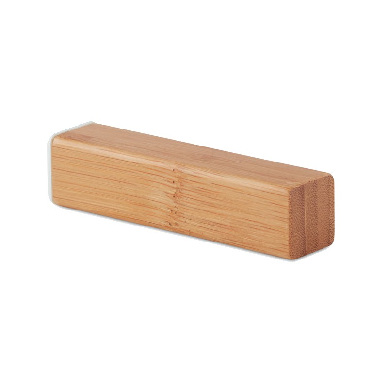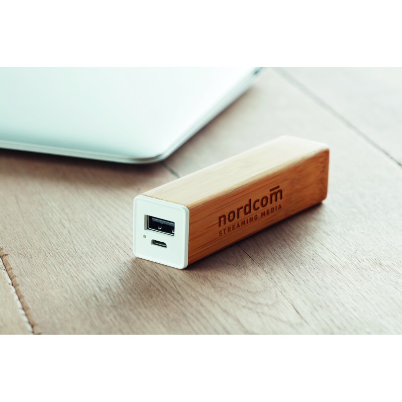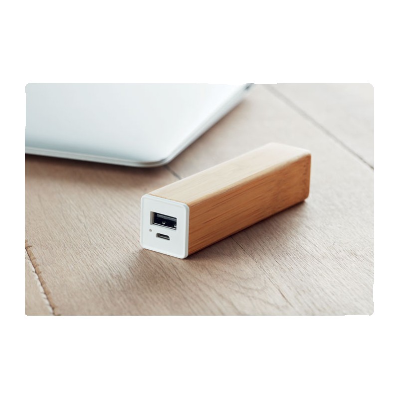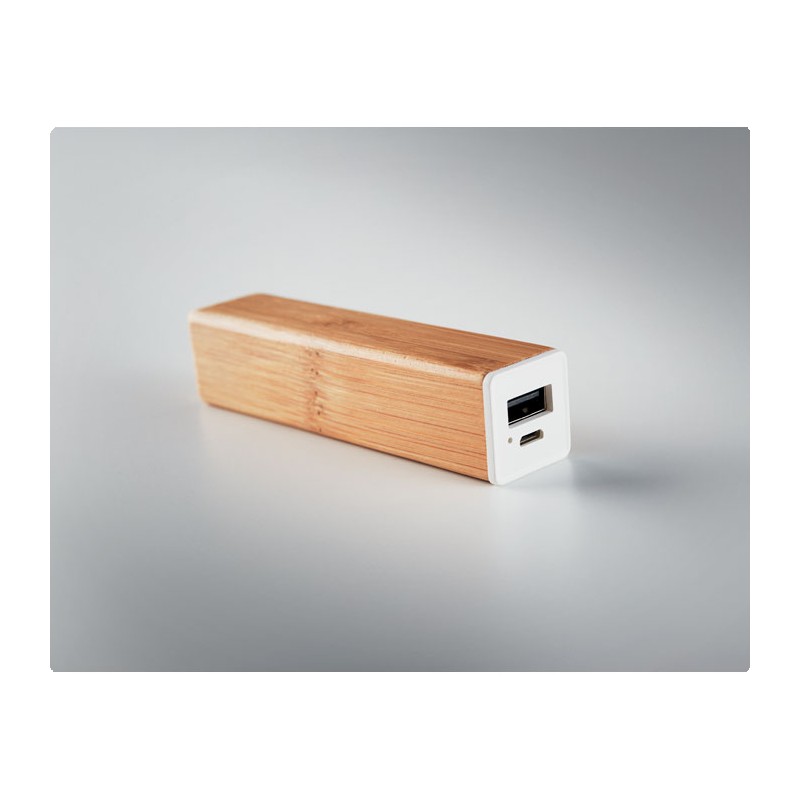 Powerbank 2200 mAh dans un étui en bambou. Convient aux smartphones, sortie DC5V / 1A actuelle. Comprend un voyant et un câble USB avec prise micro USB. Connecteur de type C inclus. Le bambou est un produit naturel, et présente de légères variations de couleur, de décoration et de tailles.