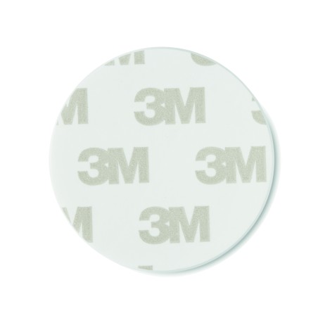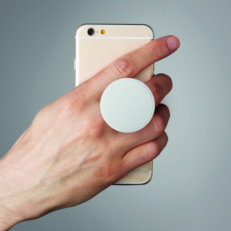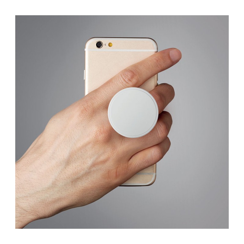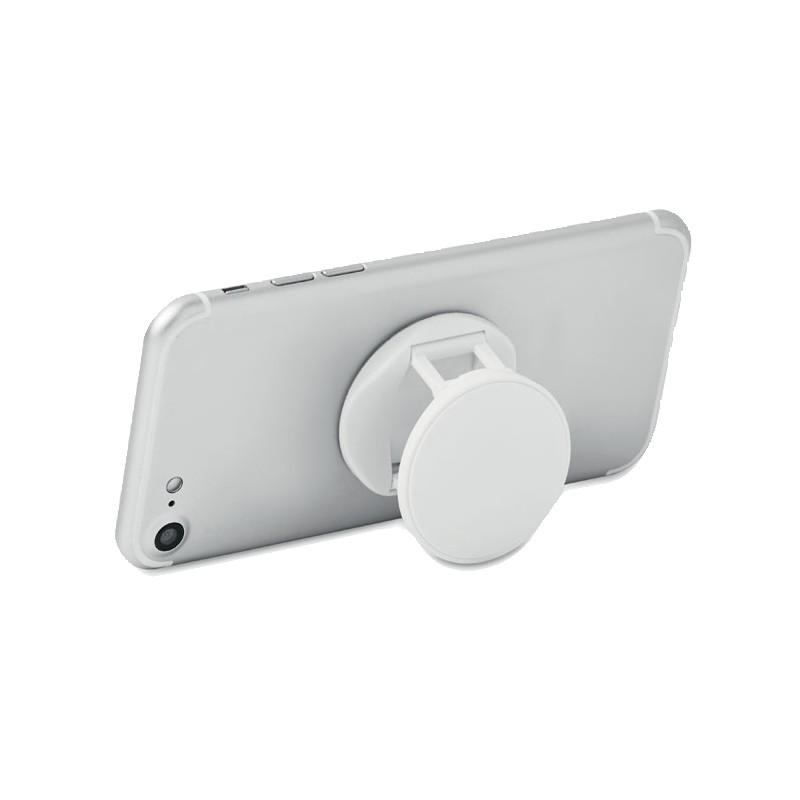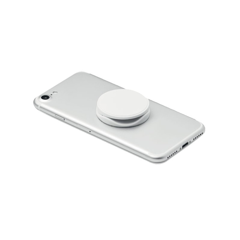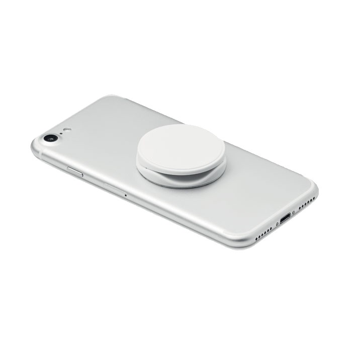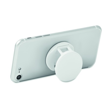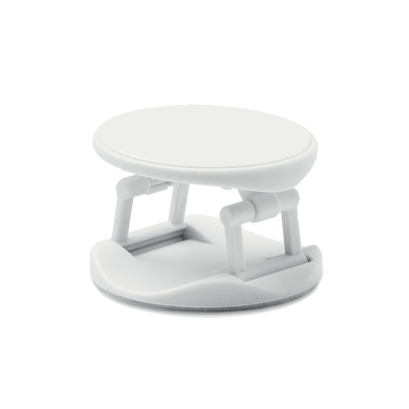 Accessoire téléphonique pliable de forme ronde en ABS avec fonction support et socle de téléphone. Autocollant 3M au dos du produit.