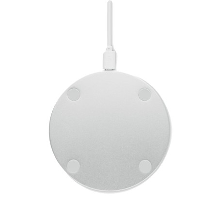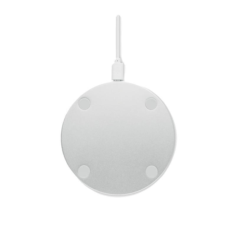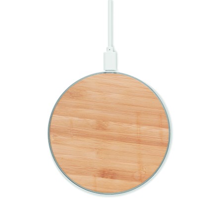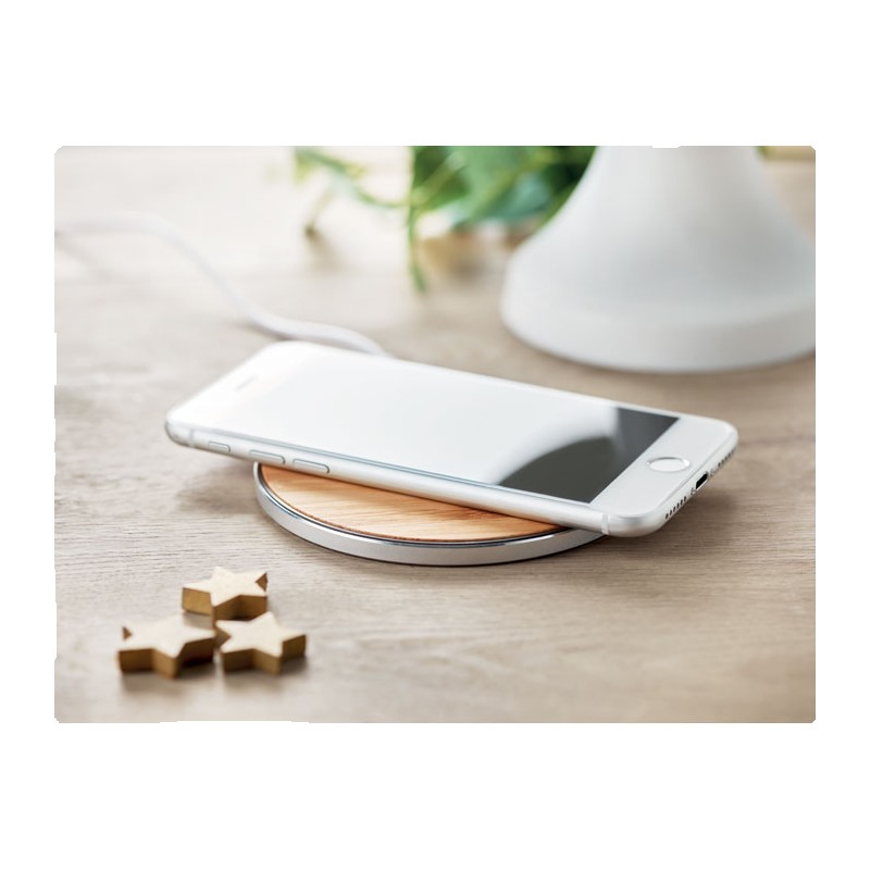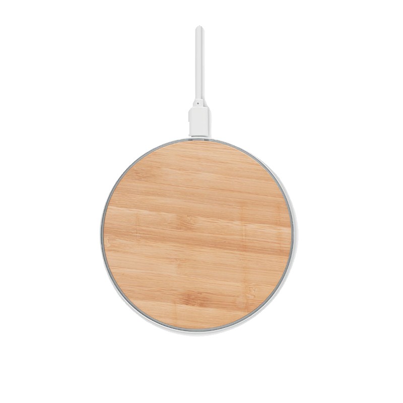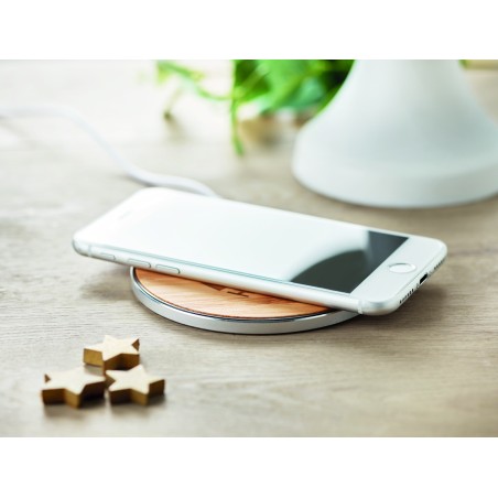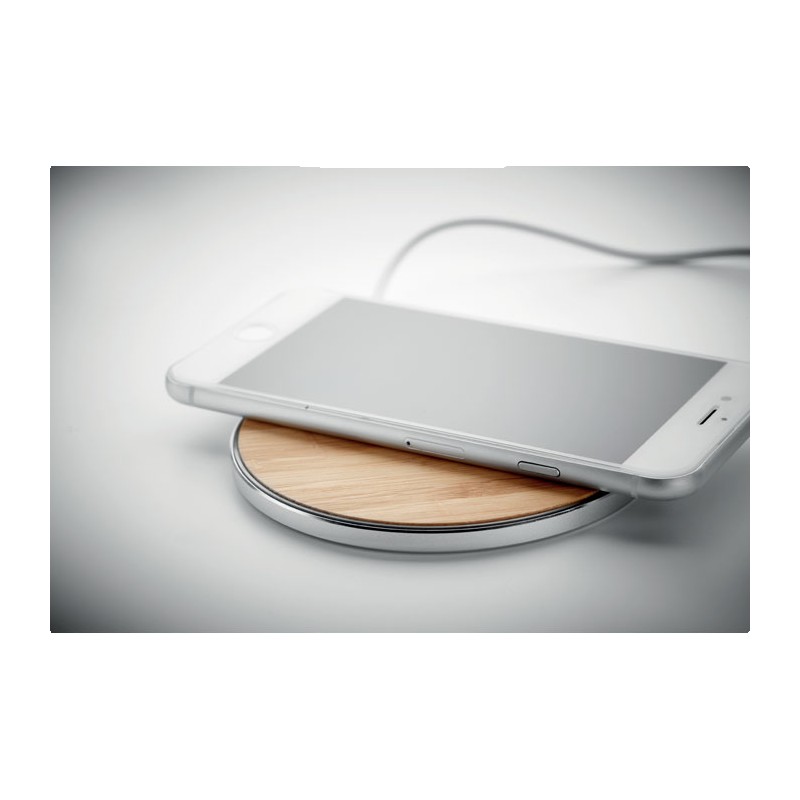 Chargeur sans fil bambou et aluminium. Indicateur de charge bleu. Sortie: DC9V/1.1A (10W). Le bambou est un produit naturel.
