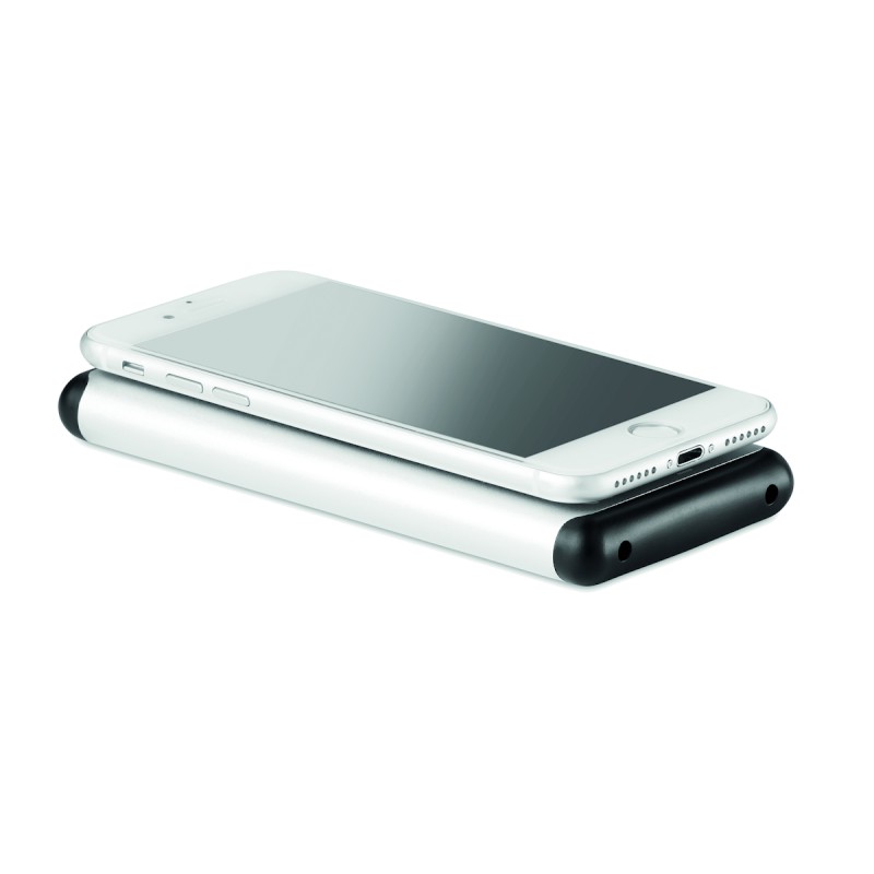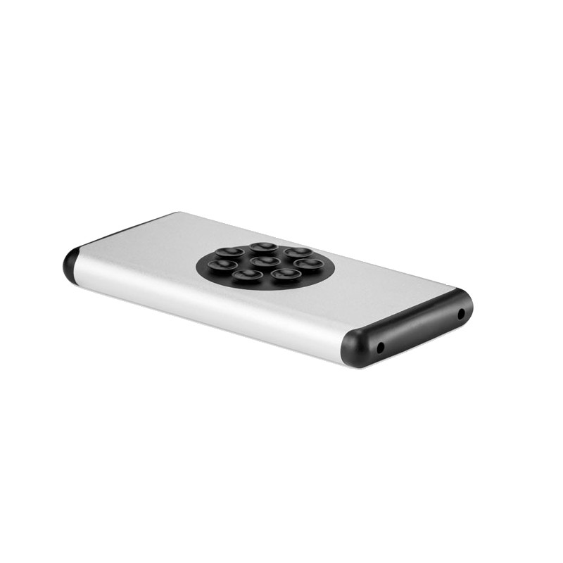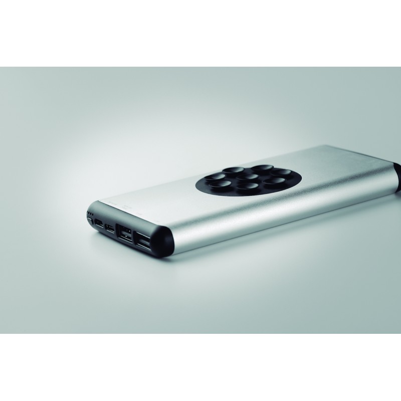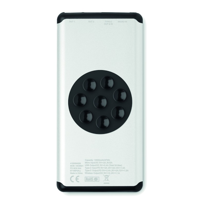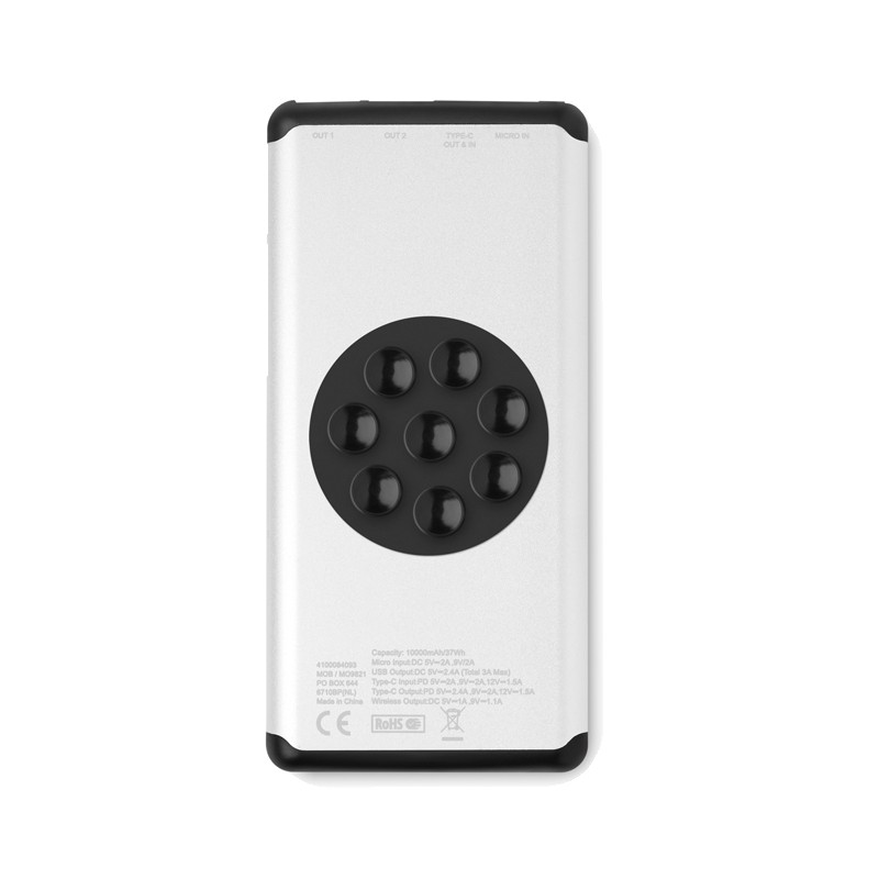 Powerbank 10000 mAh dans boîtier aluminium recyclé avec ventouse. Sortie sans fil 2A pour charge rapide, et prise d'alimentation power delivery (PD) pour recharger les ordinateurs portables les plus récents.