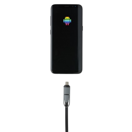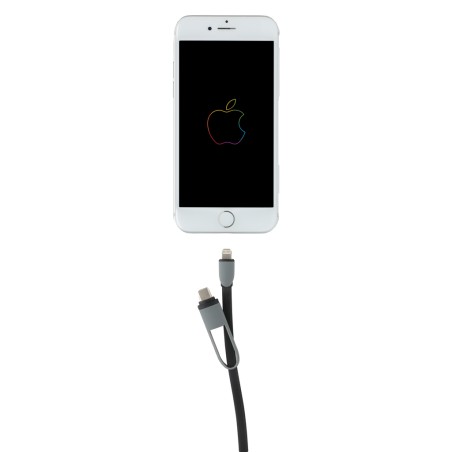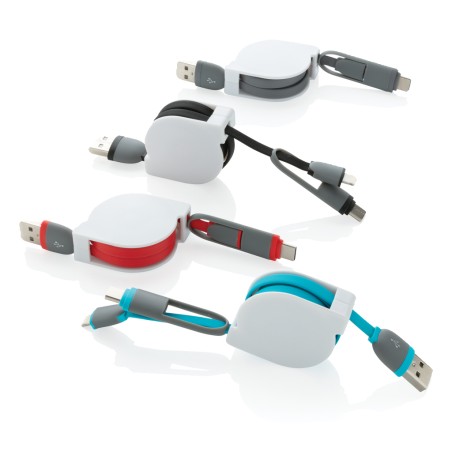Câble de charge compact et rétractable 3 en 1 avec type C et connexion double pour IOS et Android qui nécessitent le micro USB. Grace à son mécanisme rétractable, le câble plat de 100cm peut facilement être emmené n'importe où sans s'emmêler. Boitier en ABS avec câble en TPU. Synchronisation possible.