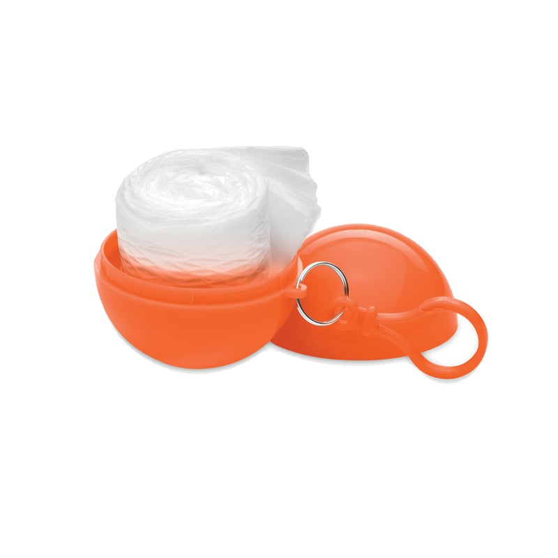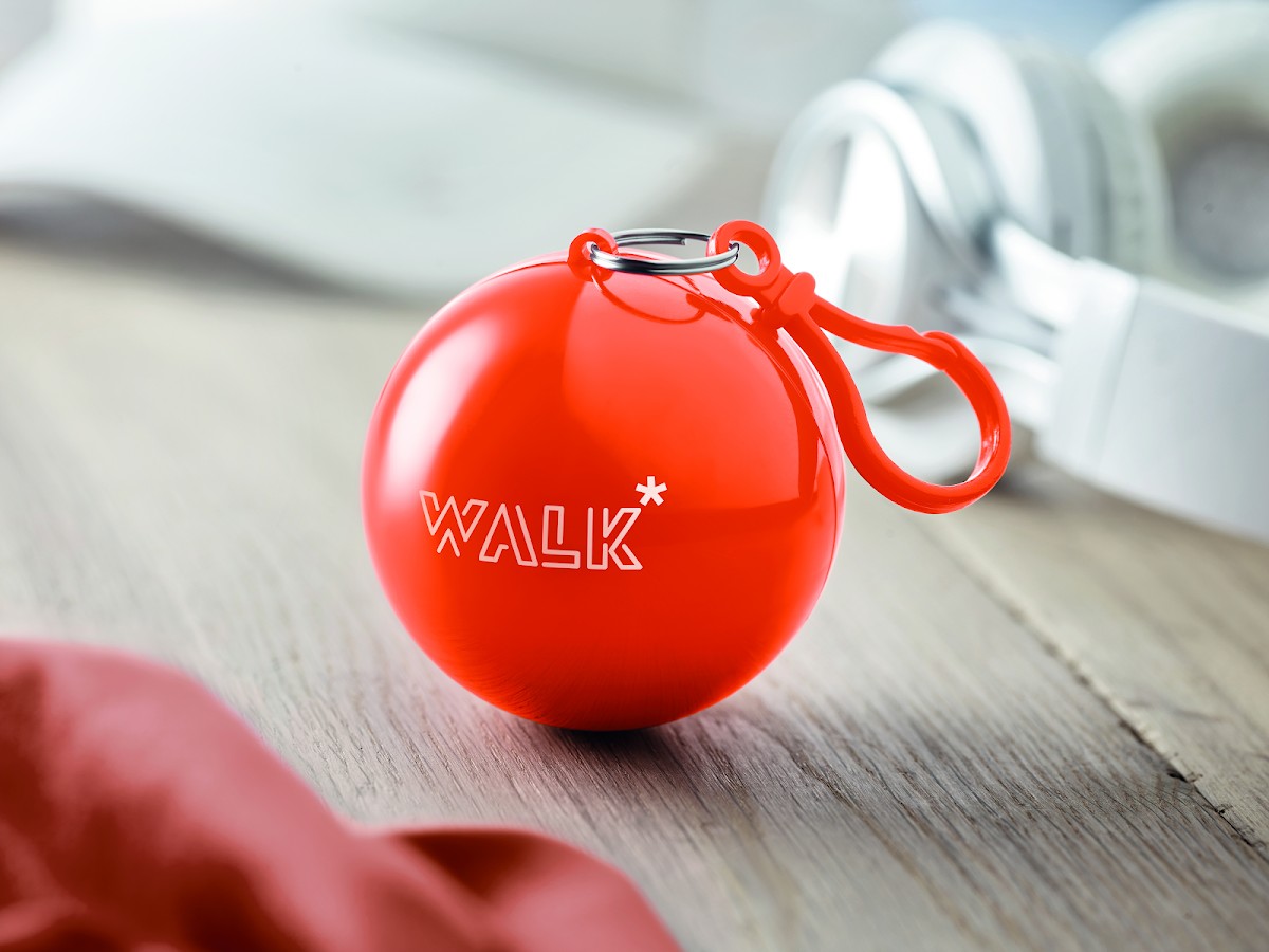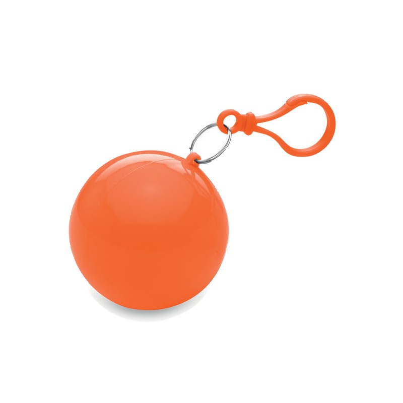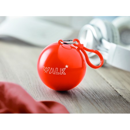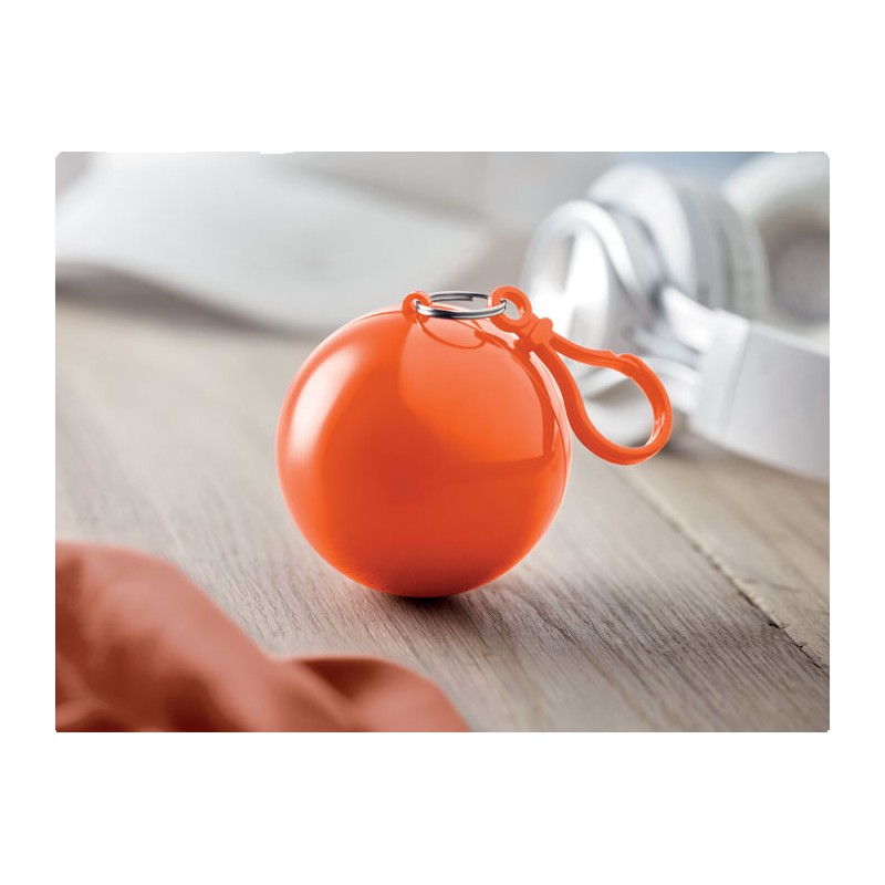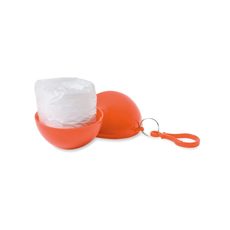 Poncho de pluie transparent en PE, présenté dans une coque en AS avec un mousqueton.