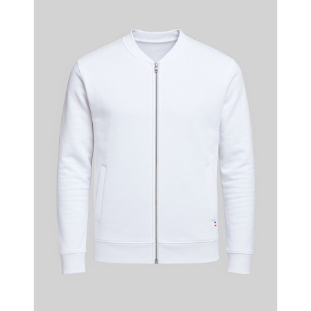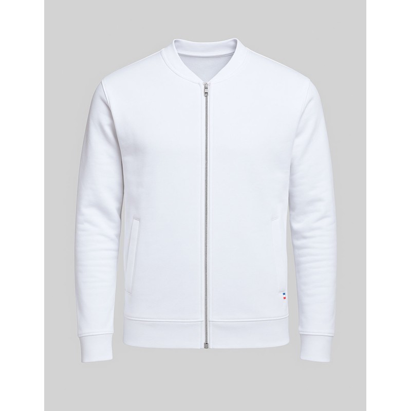 Blouson Made in France façon Teddy. 80% coton biologique certifié OCS, 20% polyester recyclé. 2 poches mains passepoilées. Matière Terry 350g/m² lavée, non grattée pour éviter le boulochage + traitement silicone pour améliorer la longévité du vêtement. Col en demi lune. Double piqure en bas de veste. Bande de propreté au col. Zip central YKK.