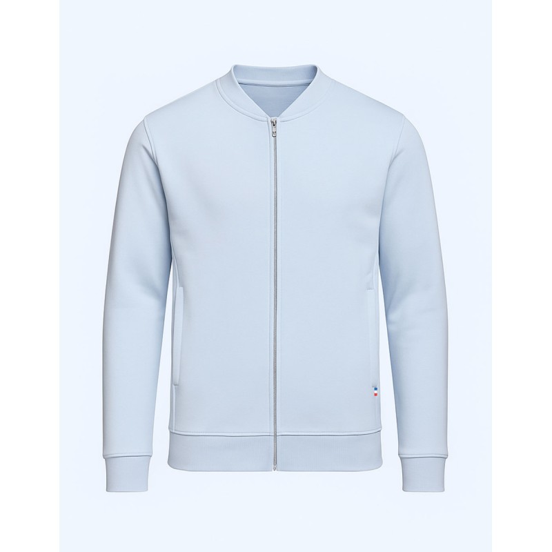 Blouson Made in France façon Teddy. 80% coton biologique certifié OCS, 20% polyester recyclé. 2 poches mains passepoilées. Matière Terry 350g/m² lavée, non grattée pour éviter le boulochage + traitement silicone pour améliorer la longévité du vêtement. Col en demi lune. Double piqure en bas de veste. Bande de propreté au col. Zip central YKK.